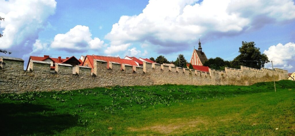 Przejeżdżając samochodem przez miejscowość od razu dostrzegamy potężne mury obronne z Bramą Krakowską, którą wchodzimy do miasta. Zachowały się do naszych czasów mury o długości prawie 700 m, blanki i strzelnice z XIV w. Zostały one odrestaurowane i oddane do zwiedzania. Po niektórych fragmentach możemy obecnie spacerować.